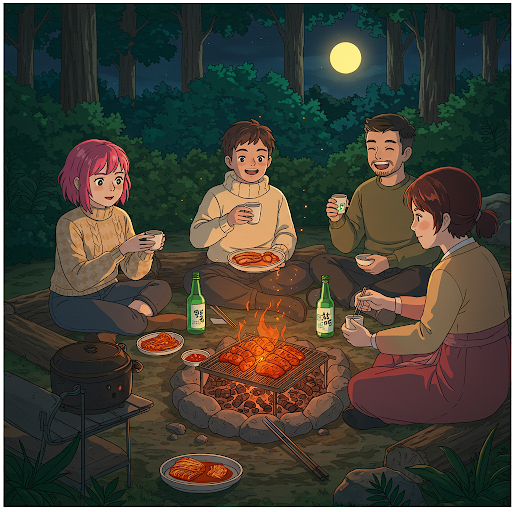 • 캠프파이어 감자 & 고구마: 캠프파이어의 잔불에 구워 먹는 감자와 고구마는 달콤하고 따뜻하여 전통주와 함께 즐기면 더욱 낭만적인 분위기를 연출할 수 있습니다. (막걸리와 잘 어울립니다.)