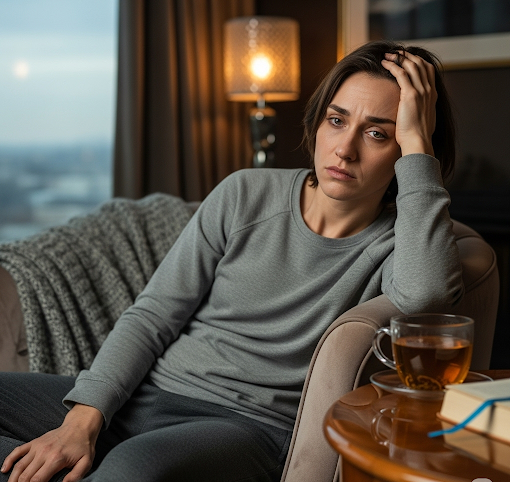 만성 피로와 스트레스에 지친 현대인의 모습을 표현한 이미지입니다.